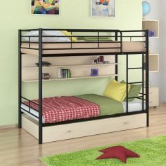 Кровать комплектуется вместительным выкатным ящиком для постельного белья или других вещей. Над нижним спальным местом располагается полка, на которой удобно разместить книги или аксессуары.