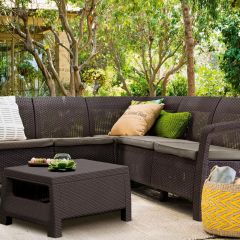 Элегантность и функциональность в одном комплекте! Выполненный с высокой тщательностью угловой комплект Корфу Релакс, состоящий из удобного дивана и стильного столика, обеспечит пользователям максимальный комфорт использования. Мебель легкой, но устойчивой конструкции, выполнена из высококачественного полимера, устойчивого к воздействию неблагоприятных погодных условий/ Оригинальная текстура мебели, напоминающая ротанговый переплет, профилированное сиденье и мягкие подушки безусловно являются преимуществом данного продукта.